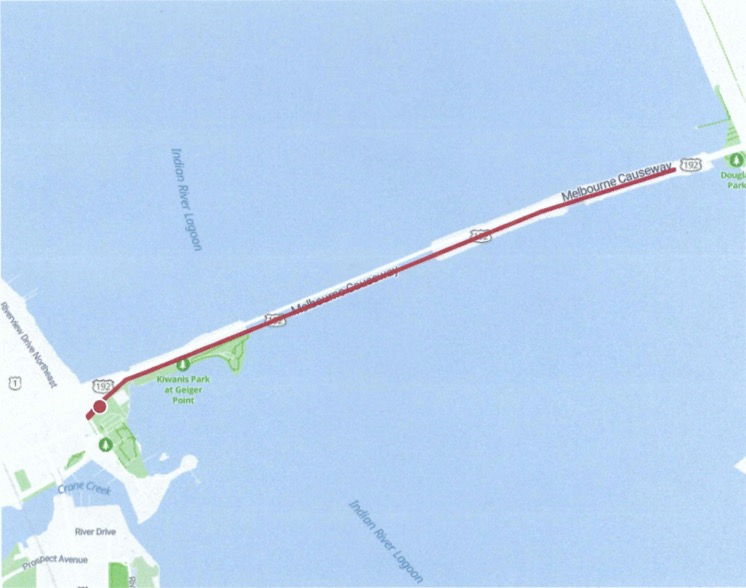 · Turn left and run west on northernmost westbound lane of Melbourne Causeway (Causeway will be coned)